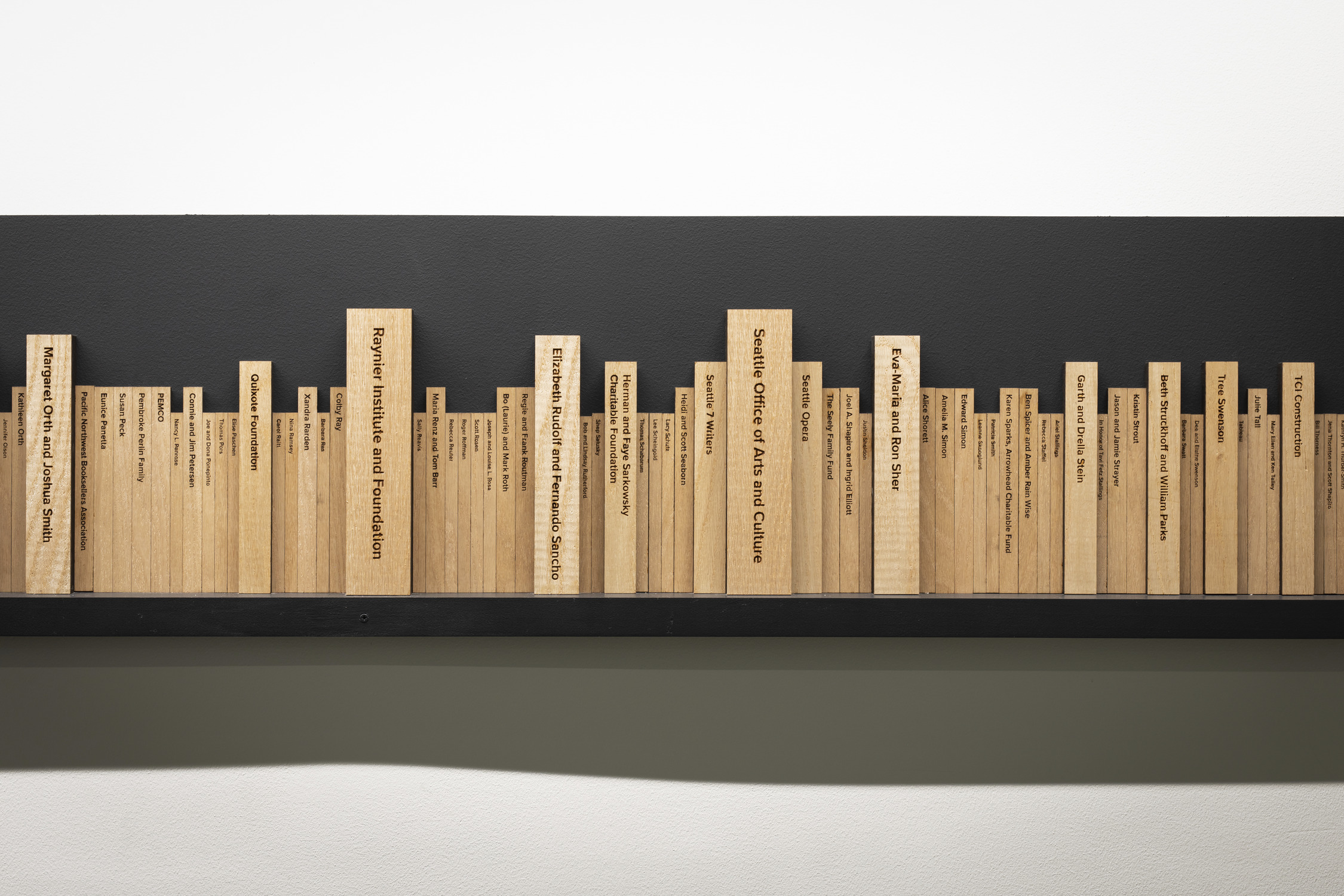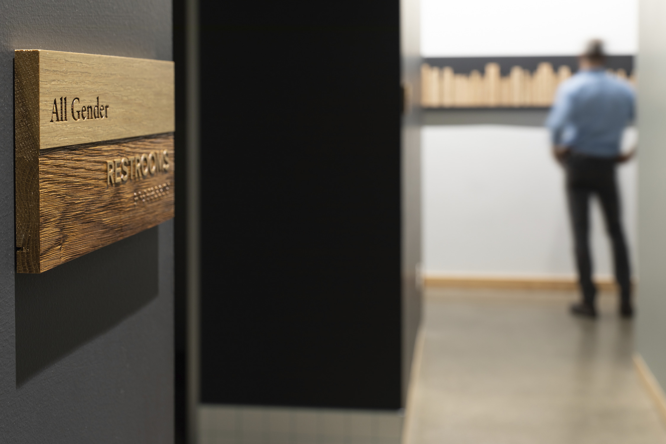 Room signage was fabricated from wood wall offcuts to reduce waste and cost while also creating a sense of consistency throughout. A donor recognition wall uses a similar procedure of laser etching wood slats, reminiscent of book spines. An installation in one of the classrooms celebrates a vibrant array of the writer's most basic instrument: the pencil.